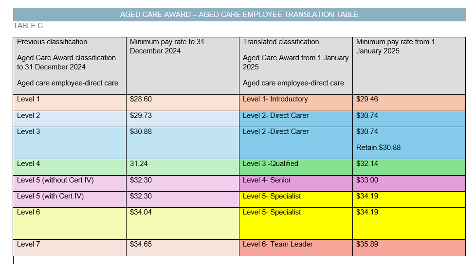 Table C below shows you the current award minimum hourly rate up to 31 December 2024 and what your new minimum hourly rate will be from 1 January 2025. Table C also shows you how you will translate from the current Aged Care Award classification structure to the new one.