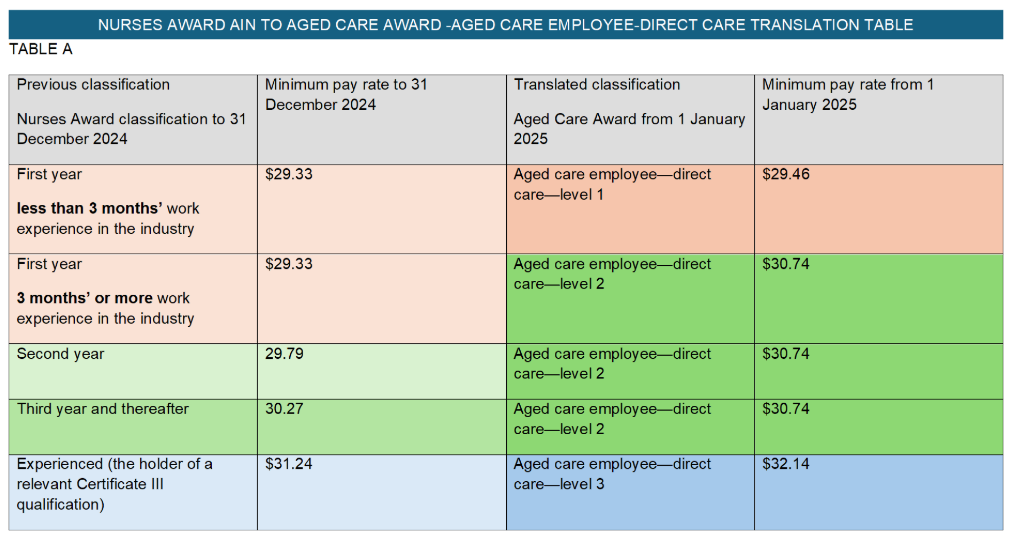 Table A below shows you the current award minimum hourly rate up to 31 December 2024 and what your new minimum hourly rate will be from 1 January 2025. Table A also shows you how you will translate from the Nurses Award to the Aged Care Award.