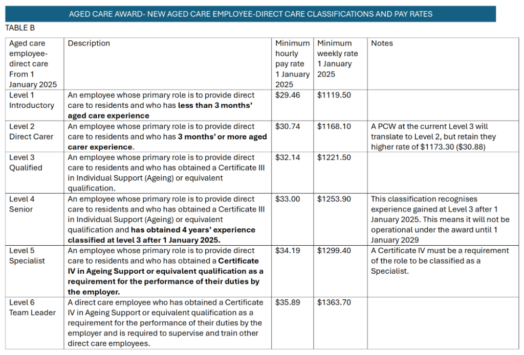 See Table B below for more details about the Aged Care Employee-Direct Care structure.