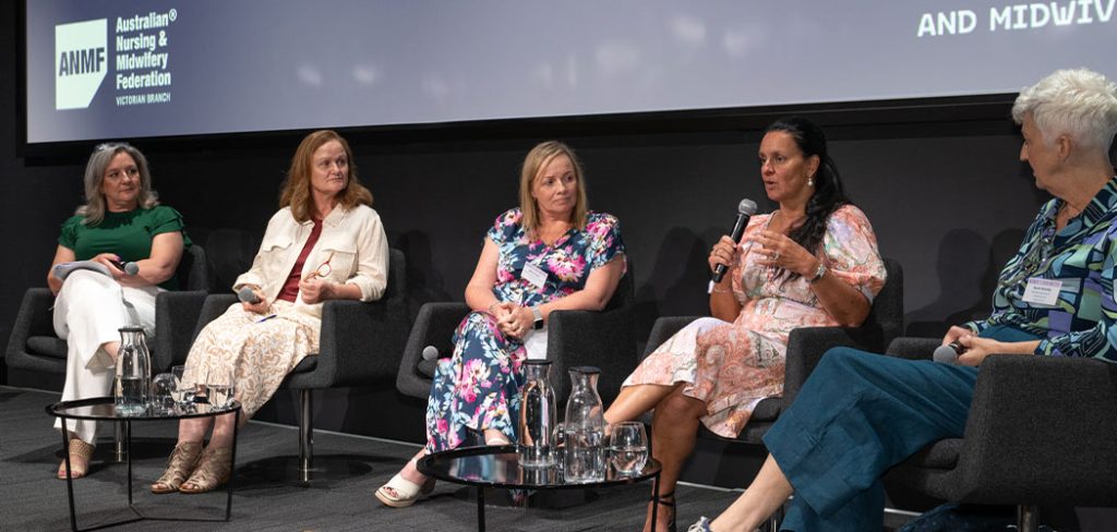 The ANMF (Vic Branch) Women’s Pain Matter forum, from left to right, Nicole Allan, NP Cathy Halmarick, MCH Systems Navigator Melissa Ryan, Professor Rochelle Wynne, and Endorsed Midwife Sarah Gundy. Photo: Penny Stephens