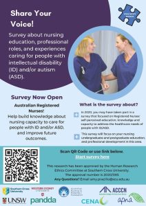 The ‘Every Nurse’s Business’ project is currently conducting its final survey to find out more about nursing education, professional roles, and experiences caring for people with ID and/or ASD. The survey is focusing on nursing undergraduate and postgraduate development and will build on the previous survey.