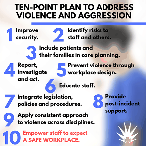 Efforts to reduce occupational violence include the ANMF (SA Branch’s) ongoing anti-violence campaign and its adoption of a 10 Point Plan to Address Violence and Aggression .